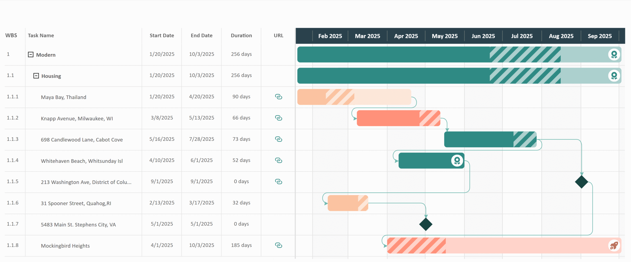 - Toggle On: Displays left Task Hierarchy in a traditional work breakdown structure (WBS) format. Each child row is indented to clearly visualize the parent-child relationship between tasks.